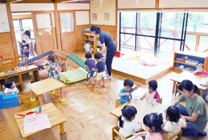 自分の事は自分で出来る様に見守っていく中で基本的な生活習慣を確立していきます。「したい事」にじっくり取り組めるような環境を整え、のびのびと活動が出来る様にしています。ぞうチームとくまチーム、2つの縦割りクラスの部屋があります。兄弟姉妹は同じクラスになります。