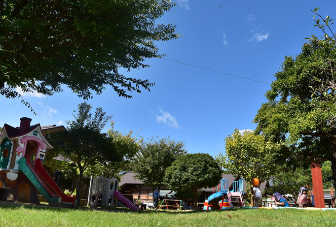たくさんの緑に囲まれ、森林の中にいるような落ち着いた雰囲気の園庭です。木の実のなる木もたくさんあり、収穫の喜びを味わうことができます。