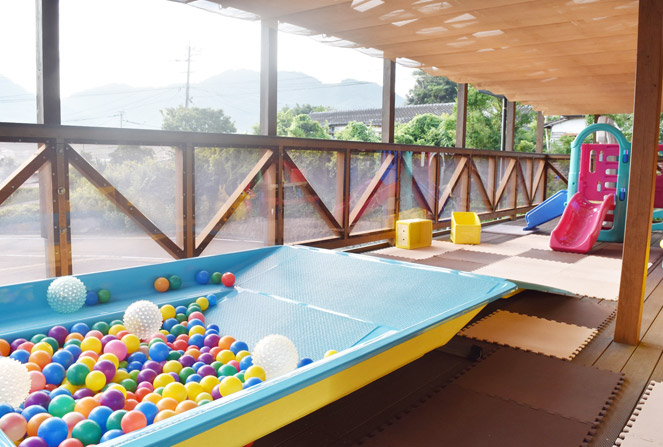0歳児と1歳児が遊ぶテラス。毎日の夕方遊びはもちろん、雨の日も外気に触れて遊ぶ事ができます。見晴らしも良く、風もよく通り子どもたちの大好きな場所です。