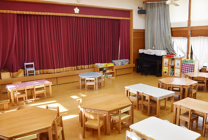 幼児クラスの子どもたちが昼食やおやつを食べる場所です。入園式やおゆうぎ会などのときは会場として使用しています。
